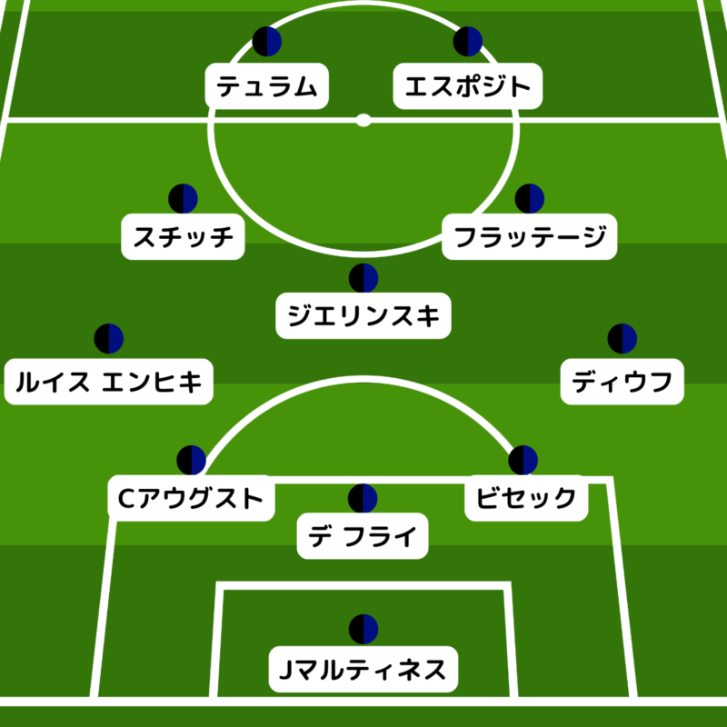 FcInterNews:7 – 唯一の“ガチメンバー”として出場し、コンディションの良くない中で2得点を記録。1点目は遠目から、2点目はヘディングで決めた。