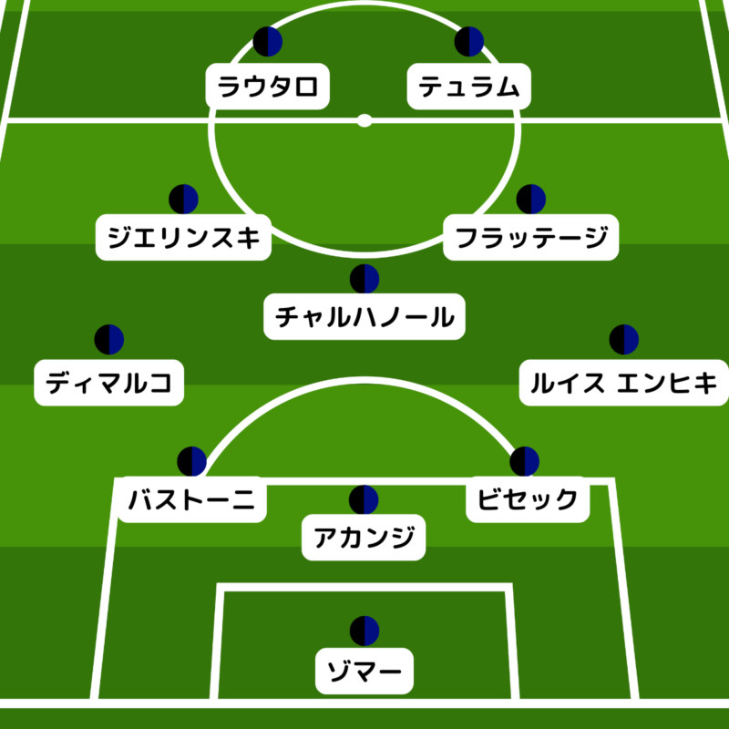 フランチェスコ・アチェルビは引き続きベンチスタートで、3バックは右からヤン・ビセック、マヌエル・アカンジ、アレッサンドロ・バストーニが並ぶ。