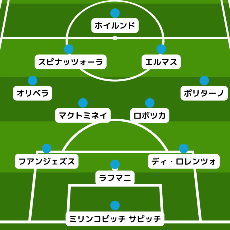ナポリはダビド・ネレスの回復が間に合わず、前線はエリフ・エルマス、レオナルド・スピナッツォーラ、ラスムス・ホイルンドの並びになる見込みだ。
