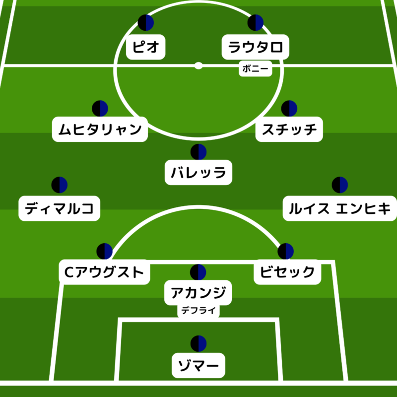 中盤は、ペタル・スチッチ、ニコロ・バレッラ、ヘンリク・ムヒタリャンという予想。FWは、ラウタロ・マルティネスとフランチェスコ・ピオ・エスポジトの並びを予想しているが、ラウタロではなくアンジェ=ヨアン・ボニーがスタメンに選ばれるかもしれない。
