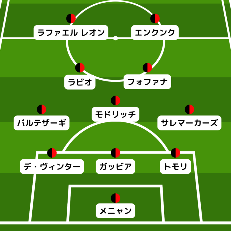 前節フィオレンティーナ戦で休養となったルカ・モドリッチらが先発に戻ることが予想されている。一方で前線については予想が分かれており、『MilanNews』はクリスティアン・プリシッチとラファエル・レオンとしたが、『スカイ』はプリシッチが外れてクリストファー・エンクンクが起用されると予想した。