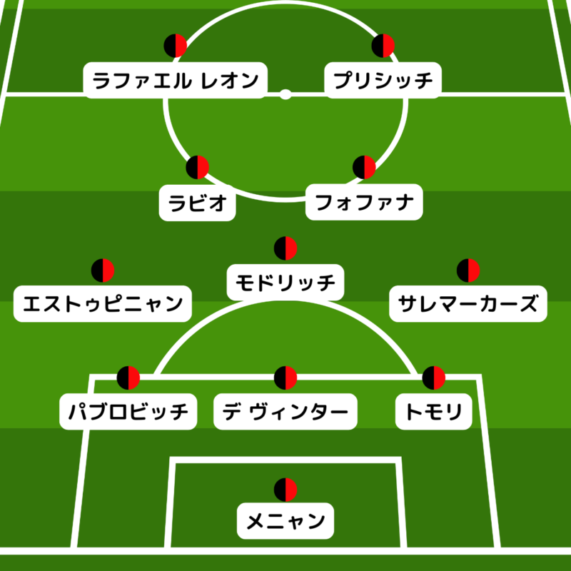 中盤は、ルカ・モドリッチとアドリアン・ラビオが不動で、あと1枠をユスフ・フォファナ、アルドン・ヤシャリ、サムエレ・リッチの3人で争っている模様だ。